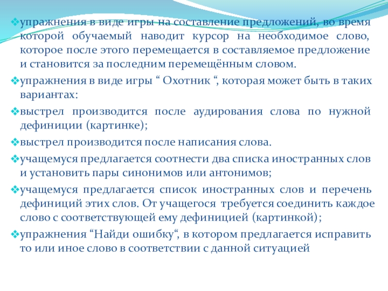 Слайд 17упражнения в виде игры на составление предложений, во время которой обучаемый