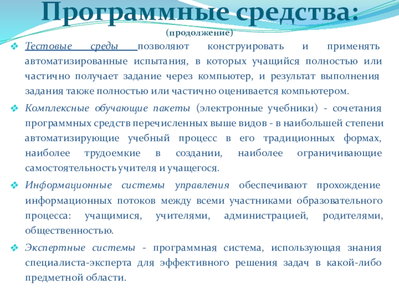 Комплексные обучающие пакеты (электронные учебники) - сочетания программных средств перечисленных выше видов - в наибольшей степени автоматизирующие учебный процесс в его традиционных формах, наиболее трудоемкие в создании, наиболее ограничивающие самостоятельность учителя и учащегося.