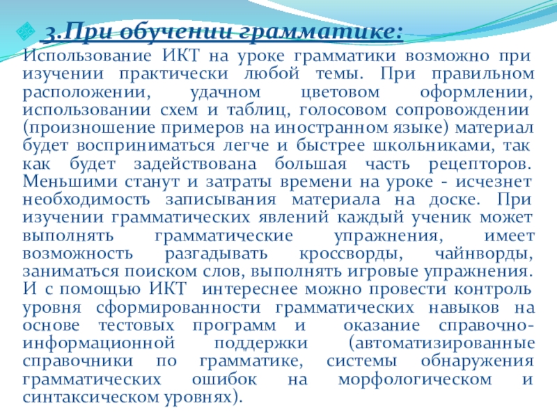 изучении практически любой темы. При правильном расположении, удачном цветовом оформлении, использовании схем и таблиц, голосовом сопровождении (произношение примеров на иностранном языке) материал будет восприниматься легче и быстрее школьниками, так как будет задействована большая часть рецепторов. Меньшими станут и затраты времени на уроке - исчезнет необходимость записывания материала на доске. При изучении грамматических явлений каждый ученик может выполнять грамматические упражнения, имеет возможность разгадывать кроссворды, чайнворды, заниматься поиском слов, выполнять игровые упражнения. И с помощью ИКТ интереснее можно провести контроль уровня сформированности грамматических навыков на основе тестовых программ и оказание справочно-информационной поддержки (автоматизированные справочники по грамматике, системы обнаружения грамматических ошибок на морфологическом и синтаксическом уровнях).