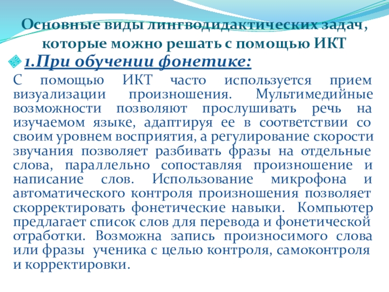 С помощью ИКТ часто используется прием визуализации произношения. Мультимедийные возможности позволяют прослушивать речь на изучаемом языке, адаптируя ее в соответствии со своим уровнем восприятия, а регулирование скорости звучания позволяет разбивать фразы на отдельные слова, параллельно сопоставляя произношение и написание слов. Использование микрофона и автоматического контроля произношения позволяет скорректировать фонетические навыки. Компьютер предлагает список слов для перевода и фонетической отработки. Возможна запись произносимого слова или фразы ученика с целью контроля, самоконтроля и корректировки.