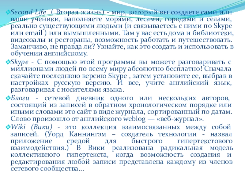 или ваши ученики, наполняете морями, лесами, городами и селами, реально существующими людьми (и связываетесь с ними по Skype или email ) или вымышленными. Там у вас есть дома и библиотеки, видеозалы и рестораны, возможность работать и путешествовать. Заманчиво, не правда ли? Узнайте, как это создать и использовать в обучении английскому.