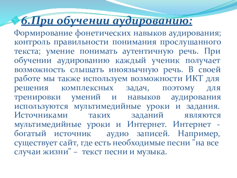 текста; умение понимать аутентичную речь. При обучении аудированию каждый ученик получает возможность слышать иноязычную речь. В своей работе мы также используем возможности ИКТ для решения комплексных задач, поэтому для тренировки умений и навыков аудирования используются мультимедийные уроки и задания. Источниками таких заданий являются мультимедийные уроки и Интернет. Интернет - богатый источник аудио записей. Например, существует сайт, где есть необходимые песни "на все случаи жизни" – текст песни и музыка.