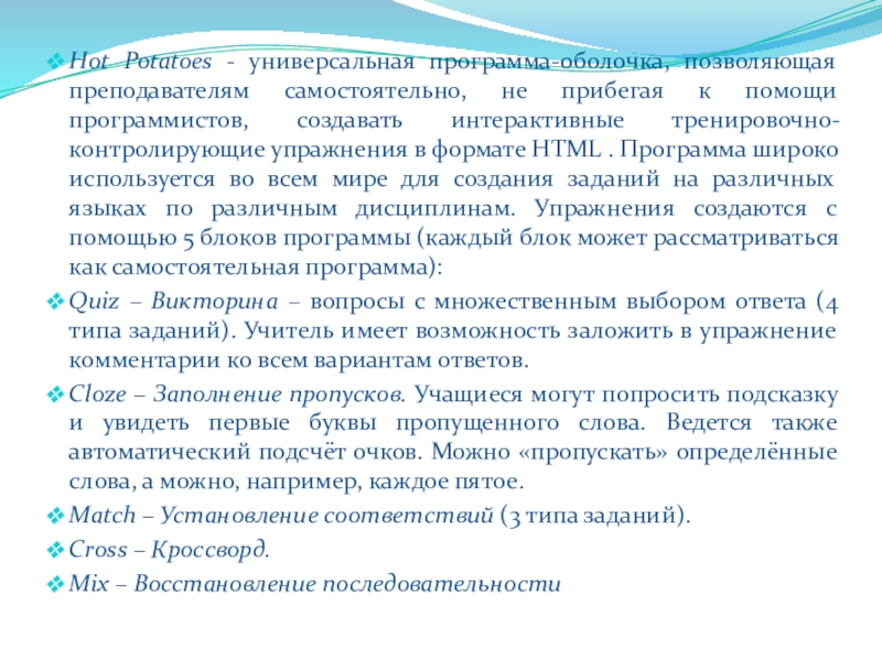 Слайд 25Hot Potatoes - универсальная программа-оболочка, позволяющая преподавателям самостоятельно, не прибегая к