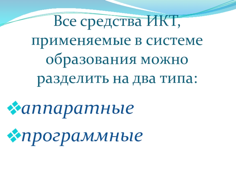 Слайд 7Все средства ИКТ, применяемые в системе образования можно разделить на два