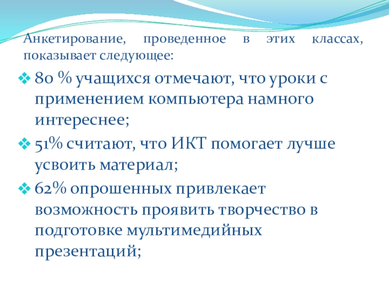 Слайд 30Анкетирование, проведенное в этих классах, показывает следующее: