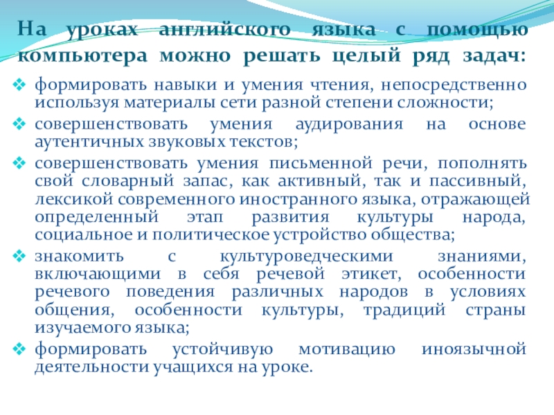 На уроках английского языка с помощью компьютера можно решать целый ряд