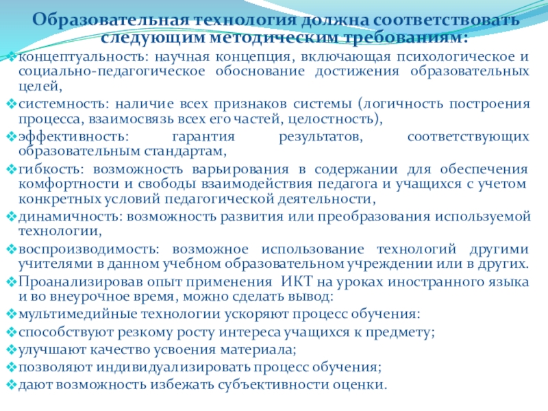 Слайд 28Образовательная технология должна соответствовать следующим методическим требованиям: