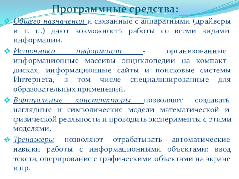 Тренажеры позволяют отрабатывать автоматические навыки работы с информационными объектами: ввод текста, оперирование с графическими объектами на экране и пр.