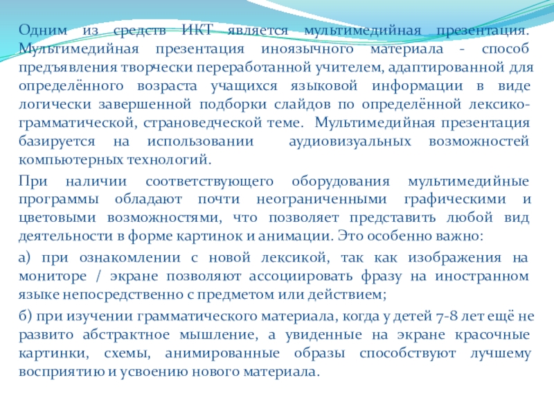 - способ предъявления творчески переработанной учителем, адаптированной для определённого возраста учащихся языковой информации в виде логически завершенной подборки слайдов по определённой лексико-грамматической, страноведческой теме. Мультимедийная презентация базируется на использовании аудиовизуальных возможностей компьютерных технологий.