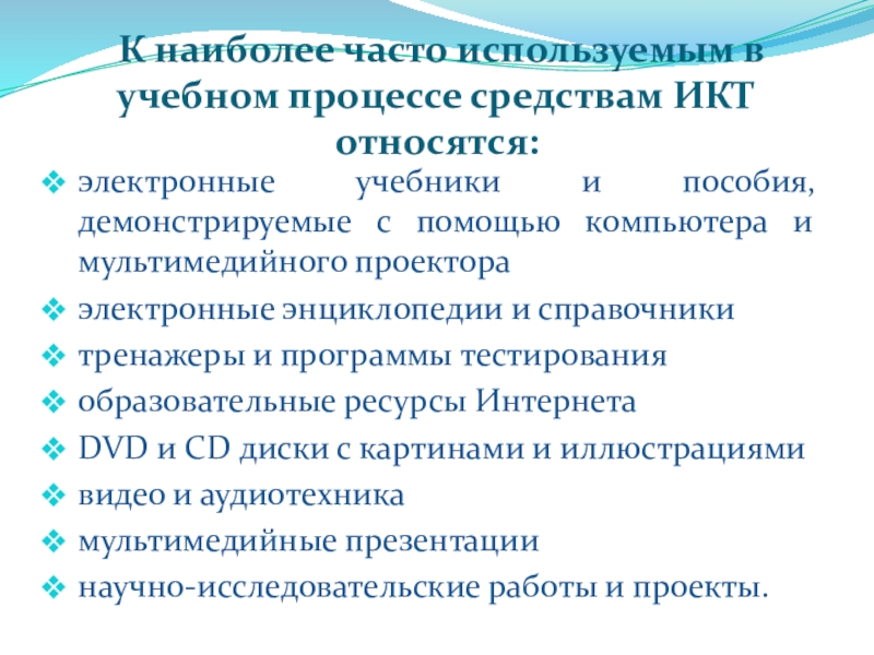 Слайд 12 К наиболее часто используемым в учебном процессе средствам ИКТ относятся: