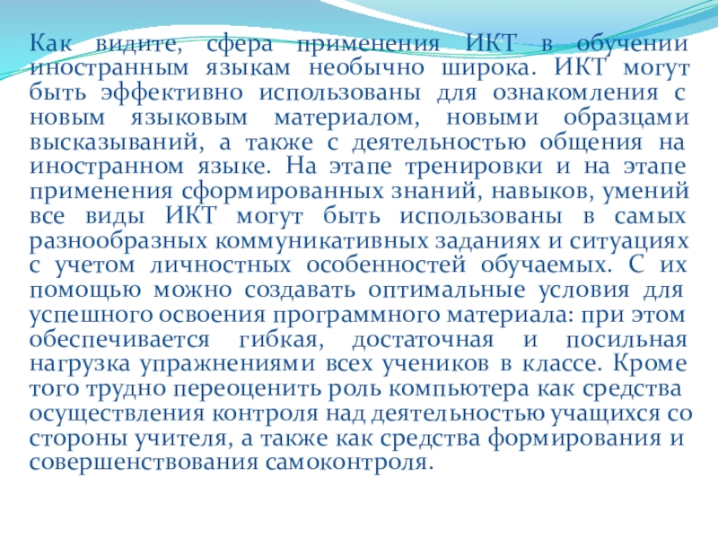 Слайд 22Как видите, сфера применения ИКТ в обучении иностранным языкам необычно широка.
