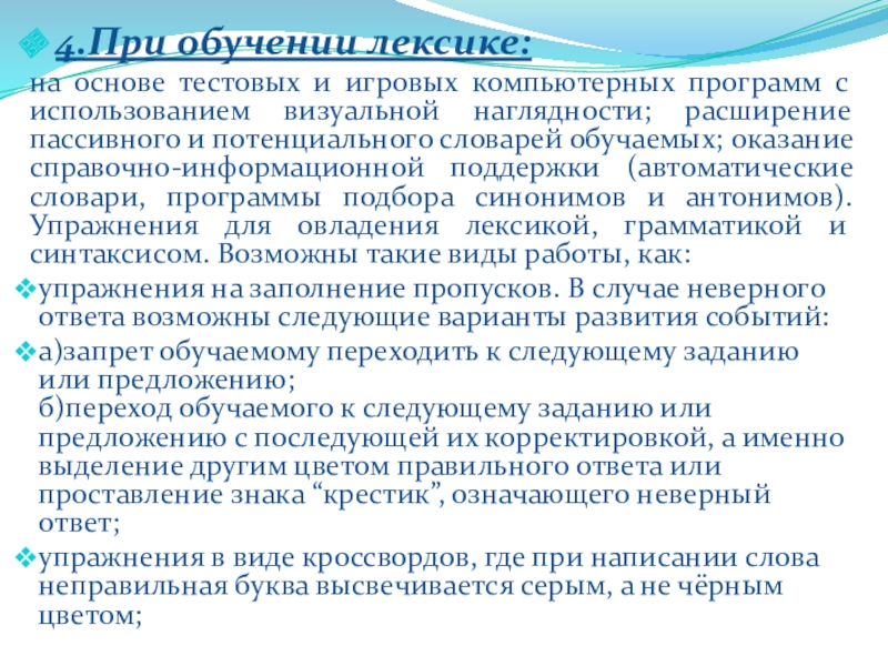 использованием визуальной наглядности; расширение пассивного и потенциального словарей обучаемых; оказание справочно-информационной поддержки (автоматические словари, программы подбора синонимов и антонимов). Упражнения для овладения лексикой, грамматикой и синтаксисом. Возможны такие виды работы, как: