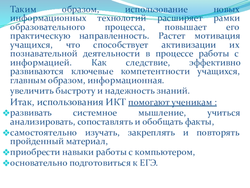 Слайд 31Таким образом, использование новых информационных технологий расширяет рамки образовательного процесса, повышает