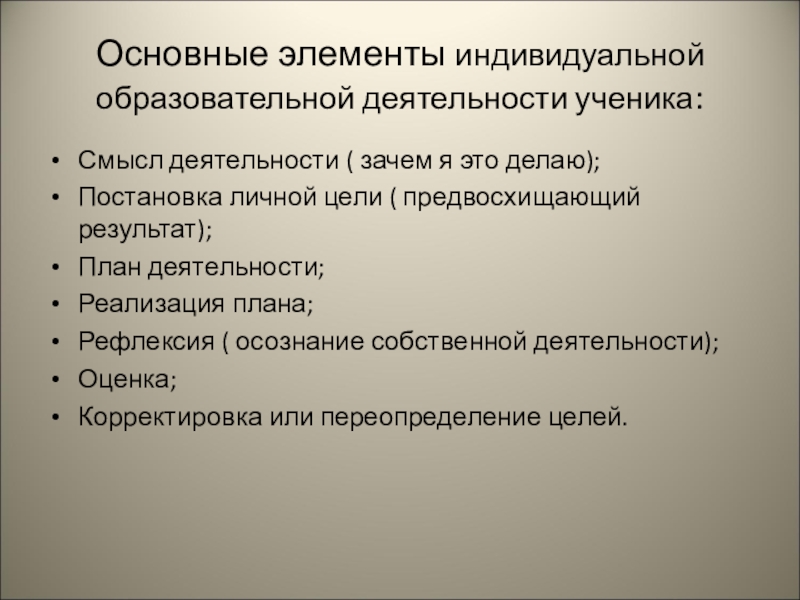 Слайд 72Основные элементы индивидуальной образовательной деятельности ученика:
