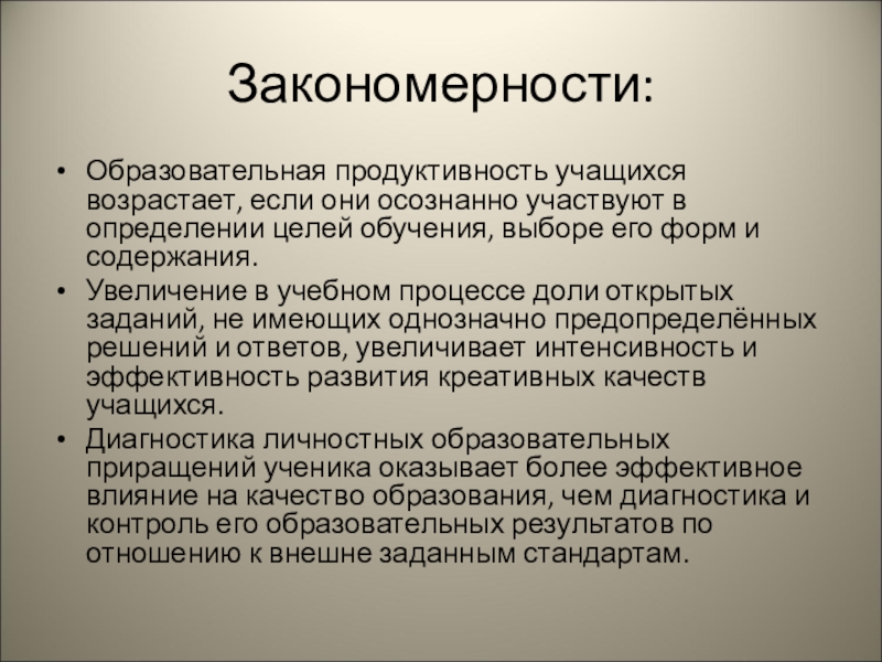 Диагностика личностных образовательных приращений ученика оказывает более эффективное влияние на качество образования, чем диагностика и контроль его образовательных результатов по отношению к внешне заданным стандартам.