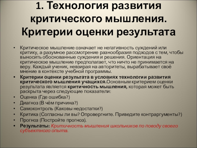 Критерии оценки результата в условиях технологии развития критического мышления учащихся.Основным критерием оценки результата является критичность мышления, которая может быть раскрыта через следующие показатели: