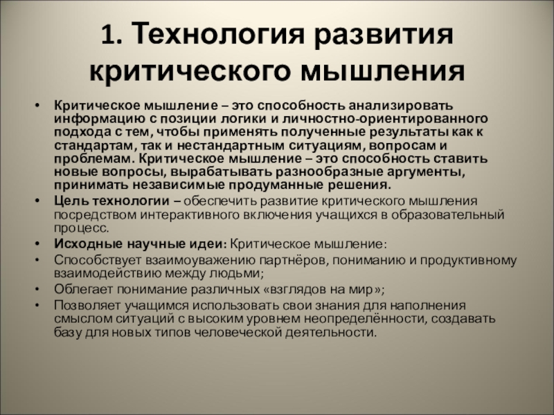 с позиции логики и личностно-ориентированного подхода с тем, чтобы применять полученные результаты как к стандартам, так и нестандартным ситуациям, вопросам и проблемам. Критическое мышление – это способность ставить новые вопросы, вырабатывать разнообразные аргументы, принимать независимые продуманные решения.