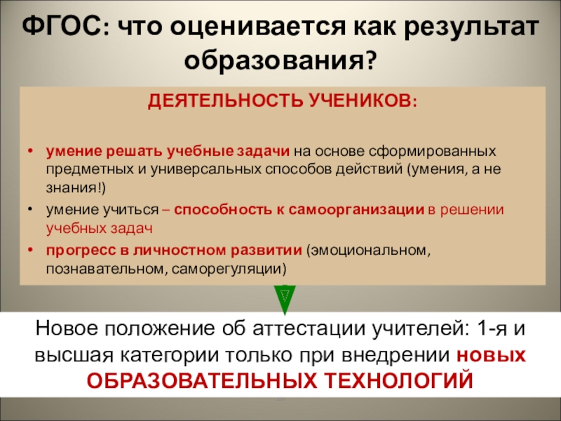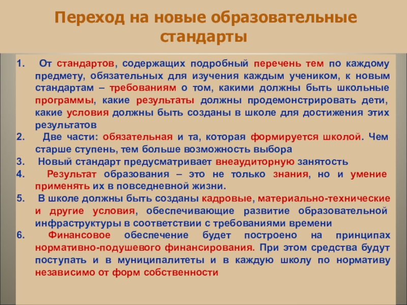 тем по каждому предмету, обязательных для изучения каждым учеником, к новым стандартам – требованиям о том, какими должны быть школьные программы, какие результаты должны продемонстрировать дети, какие условия должны быть созданы в школе для достижения этих результатов