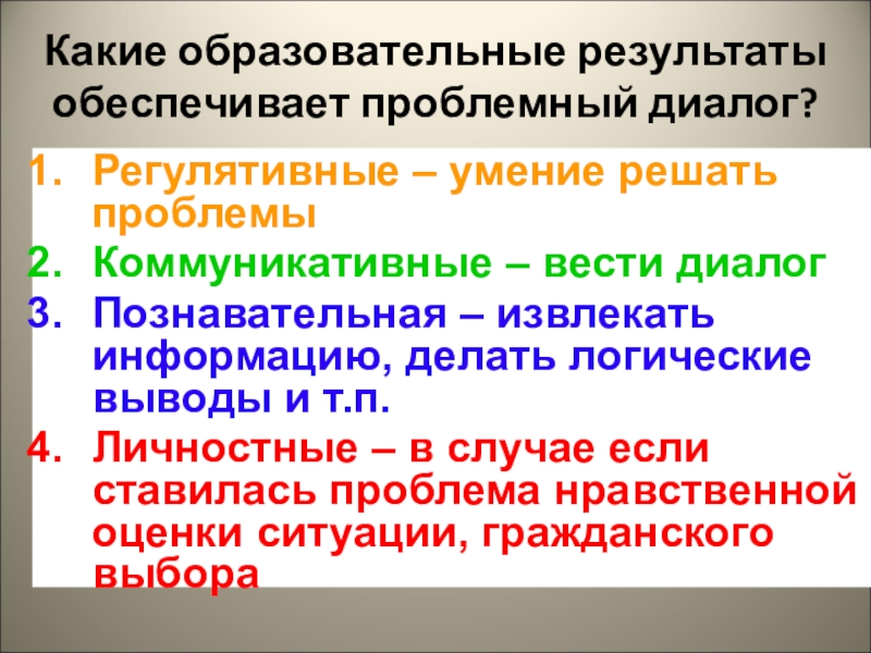 Слайд 59Какие образовательные результаты обеспечивает проблемный диалог?