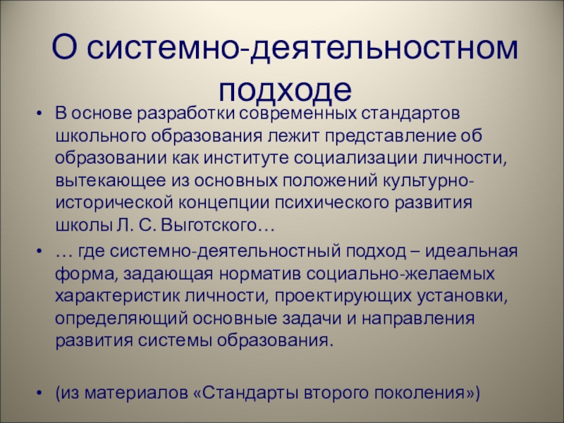 … где системно-деятельностный подход – идеальная форма, задающая норматив социально-желаемых характеристик личности, проектирующих установки, определяющий основные задачи и направления развития системы образования.