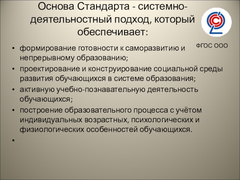 Слайд 13Основа Стандарта - системно-деятельностный подход, который обеспечивает:
