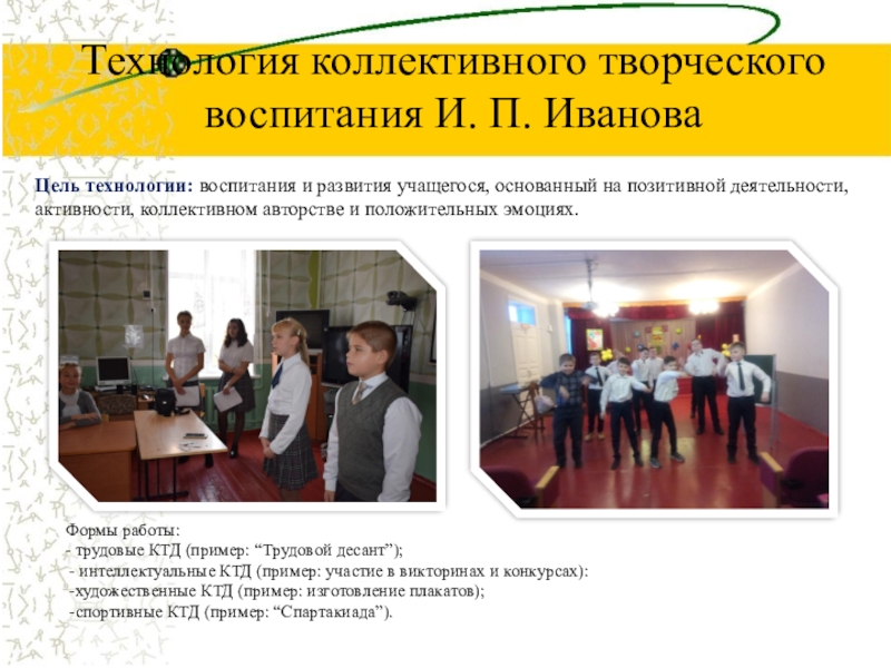 - трудовые КТД (пример: “Трудовой десант”);