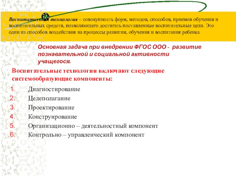 Воспитательные технологии включают следующие системообразующие компоненты: