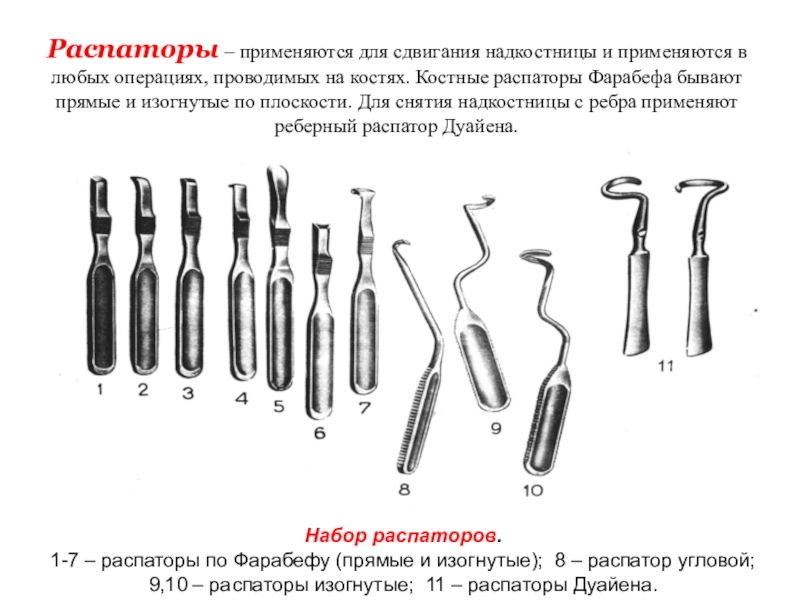 1-7 – распаторы по Фарабефу (прямые и изогнутые); 8 – распатор угловой; 9,10 – распаторы изогнутые; 11 – распаторы Дуайена.