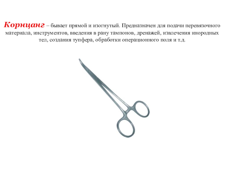 Слайд 10Корнцанг – бывает прямой и изогнутый. Предназначен для подачи перевязочного материала,
