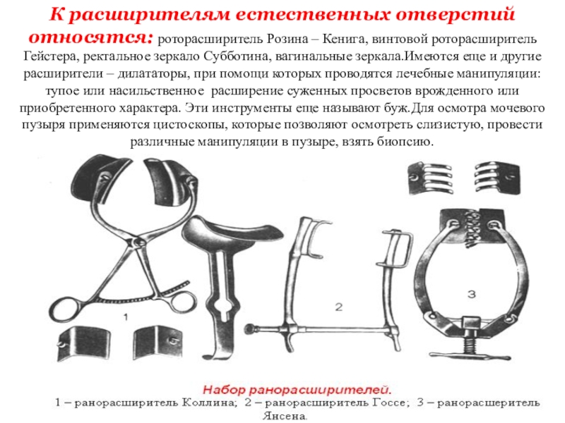 Гейстера, ректальное зеркало Субботина, вагинальные зеркала.Имеются еще и другие расширители – дилататоры, при помощи которых проводятся лечебные манипуляции: тупое или насильственное расширение суженных просветов врожденного или приобретенного характера. Эти инструменты еще называют буж.Для осмотра мочевого пузыря применяются цистоскопы, которые позволяют осмотреть слизистую, провести различные манипуляции в пузыре, взять биопсию.
