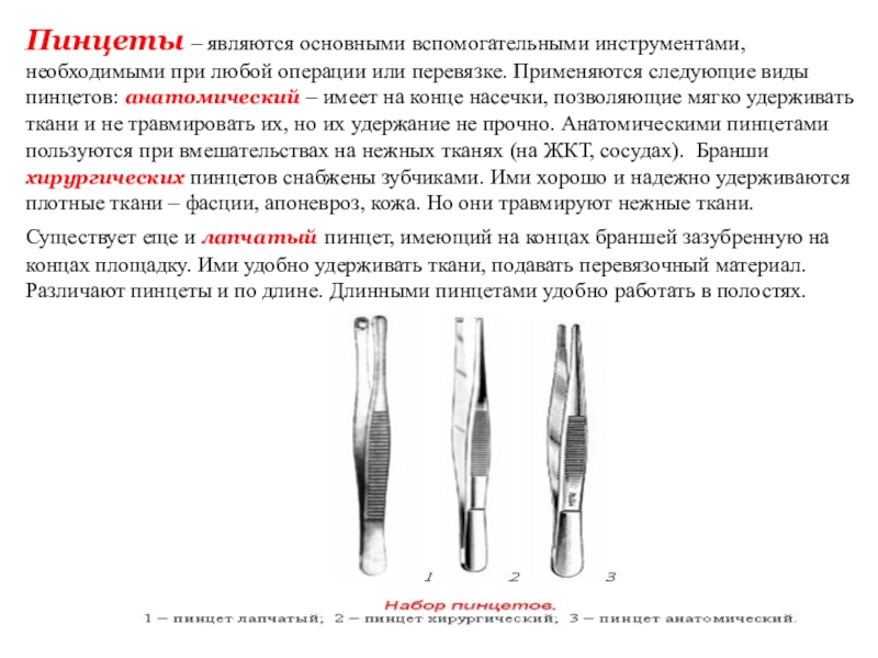 Слайд 14Пинцеты – являются основными вспомогательными инструментами, необходимыми при любой операции или
