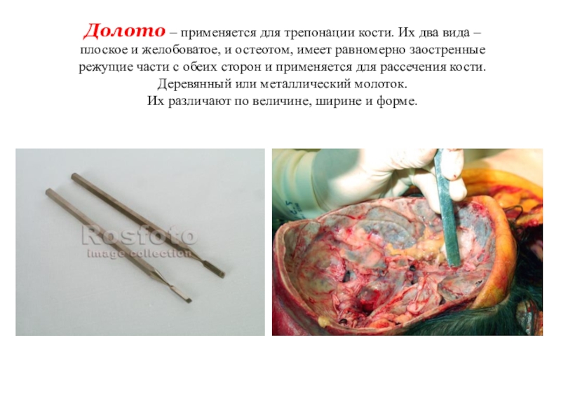 Слайд 6Долото – применяется для трепонации кости. Их два вида –плоское и