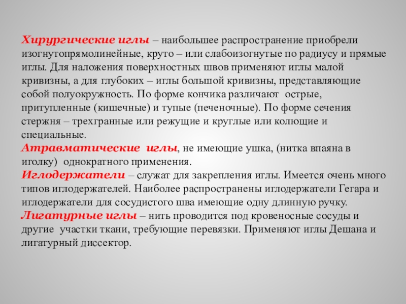 по радиусу и прямые иглы. Для наложения поверхностных швов применяют иглы малой кривизны, а для глубоких – иглы большой кривизны, представляющие собой полуокружность. По форме кончика различают острые, притупленные (кишечные) и тупые (печеночные). По форме сечения стержня – трехгранные или режущие и круглые или колющие и специальные.