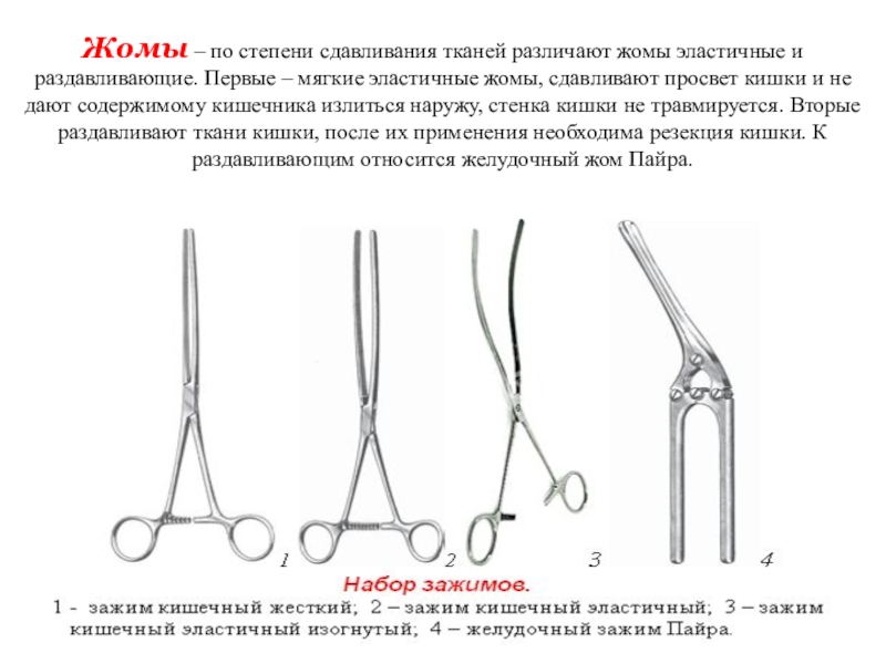 Первые – мягкие эластичные жомы, сдавливают просвет кишки и не дают содержимому кишечника излиться наружу, стенка кишки не травмируется. Вторые раздавливают ткани кишки, после их применения необходима резекция кишки. К раздавливающим относится желудочный жом Пайра.
