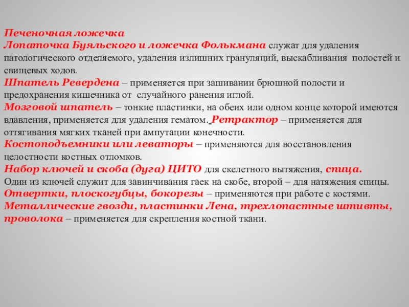 Мозговой шпатель – тонкие пластинки, на обеих или одном конце которой имеются вдавления, применяется для удаления гематом. Ретрактор – применяется для оттягивания мягких тканей при ампутации конечности.
