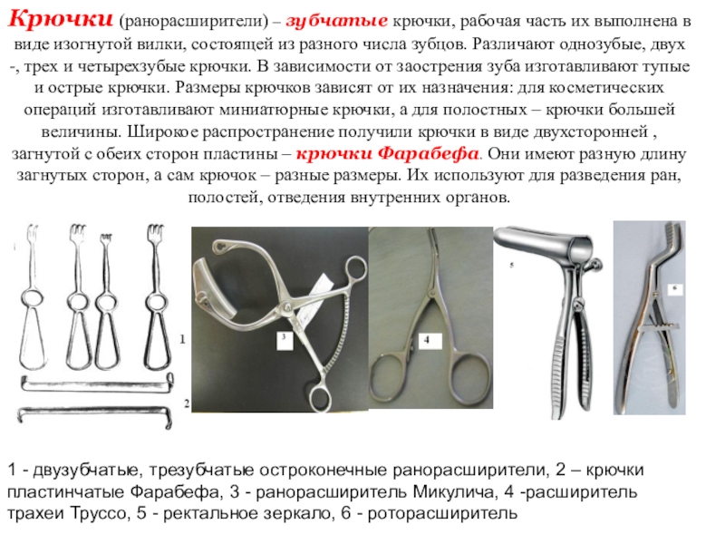 1 - двузубчатые, трезубчатые остроконечные ранорасширители, 2 – крючки пластинчатые Фарабефа, 3 - ранорасширитель Микулича, 4 -расширитель трахеи Труссо, 5 - ректальное зеркало, 6 - роторасширитель