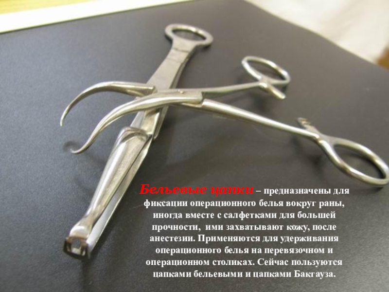 Слайд 16Бельевые цапки – предназначены для фиксации операционного белья вокруг раны, иногда