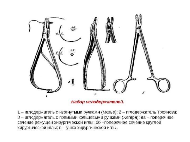 Иглодержатели – служат для закрепления иглы. Имеется очень много типов иглодержателей. Наиболее распространены иглодержатели Гегара и иглодержатели для сосудистого шва имеющие одну длинную ручку.