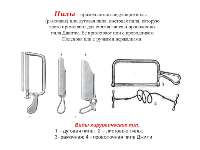 1 – дуговая пила; 2 – листовые пилы; 3- рамочная; 4 - проволочная пила Джили.