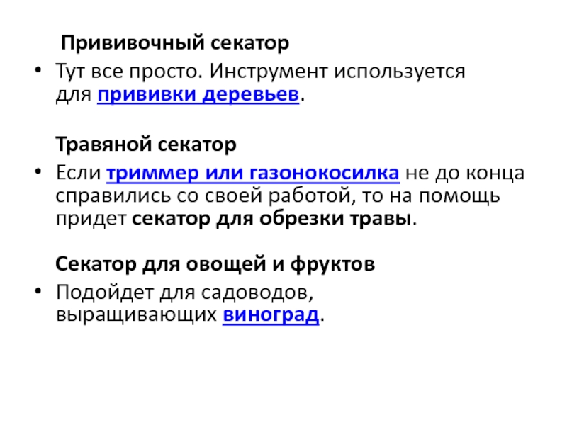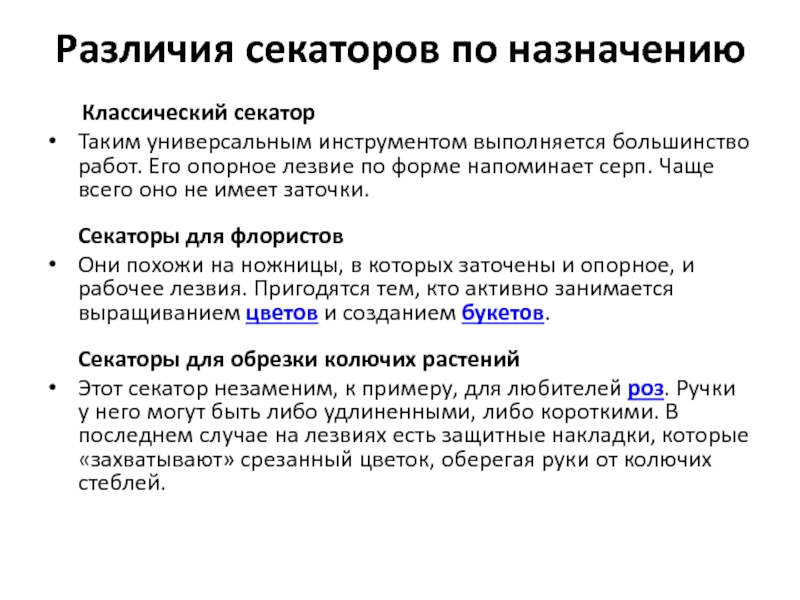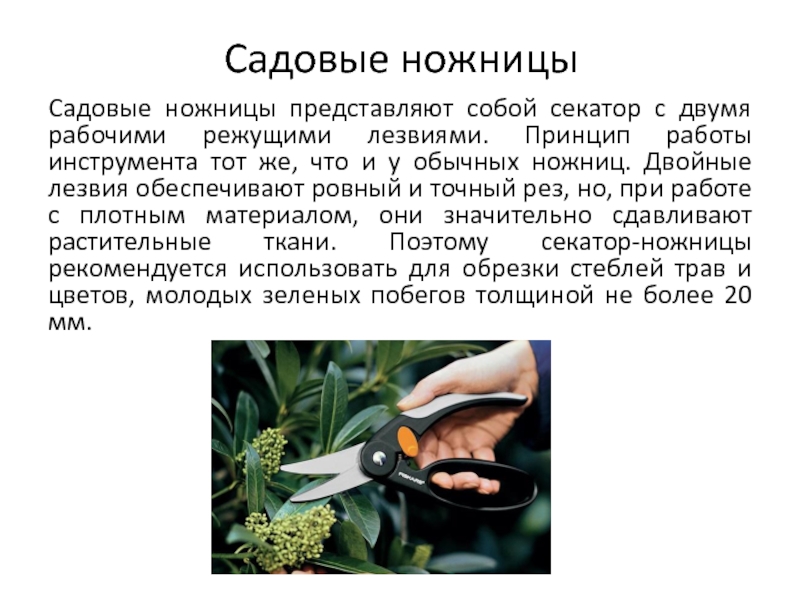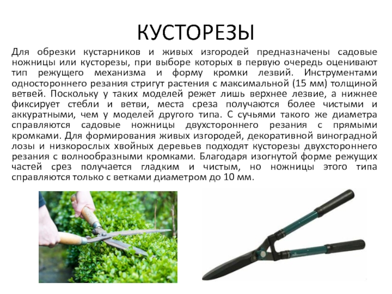 при выборе которых в первую очередь оценивают тип режущего механизма и форму кромки лезвий. Инструментами одностороннего резания стригут растения с максимальной (15 мм) толщиной ветвей. Поскольку у таких моделей режет лишь верхнее лезвие, а нижнее фиксирует стебли и ветви, места среза получаются более чистыми и аккуратными, чем у моделей другого типа. С сучьями такого же диаметра справляются садовые ножницы двухстороннего резания с прямыми кромками. Для формирования живых изгородей, декоративной виноградной лозы и низкорослых хвойных деревьев подходят кусторезы двухстороннего резания с волнообразными кромками. Благодаря изогнутой форме режущих частей срез получается гладким и чистым, но ножницы этого типа справляются только с ветками диаметром до 10 мм.