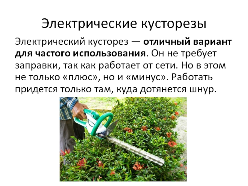 Электрический кусторез — отличный вариант для частого использования. Он не требует