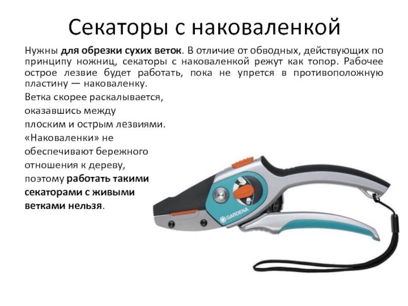 по принципу ножниц, секаторы с наковаленкой режут как топор. Рабочее острое лезвие будет работать, пока не упрется в противоположную пластину — наковаленку.