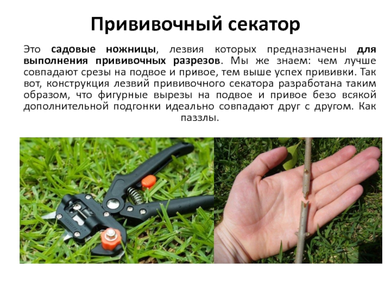 чем лучше совпадают срезы на подвое и привое, тем выше успех прививки. Так вот, конструкция лезвий прививочного секатора разработана таким образом, что фигурные вырезы на подвое и привое безо всякой дополнительной подгонки идеально совпадают друг с другом. Как паззлы.