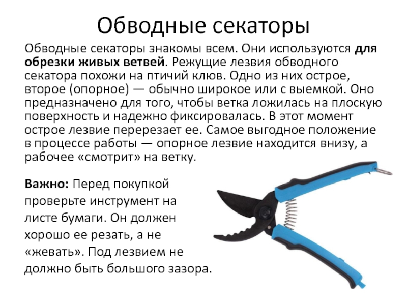 Обводные секаторы знакомы всем. Они используются для обрезки живых ветвей. Режущие