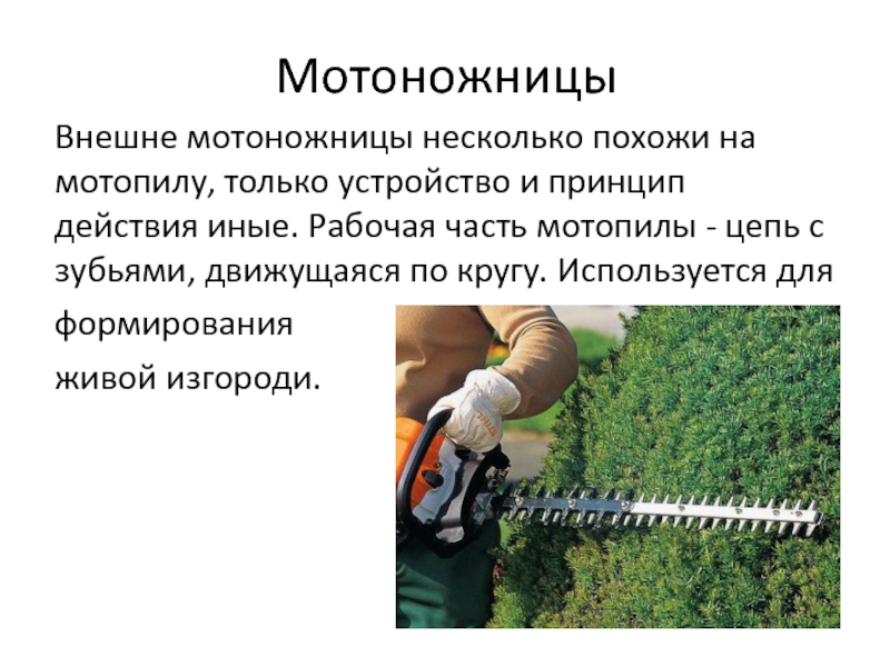Внешне мотоножницы несколько похожи на мотопилу, только устройство и принцип действия