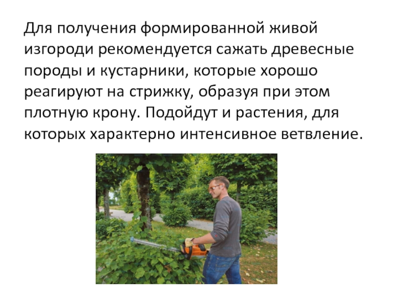Слайд 18Для получения формированной живой изгороди рекомендуется сажать древесные породы и кустарники,
