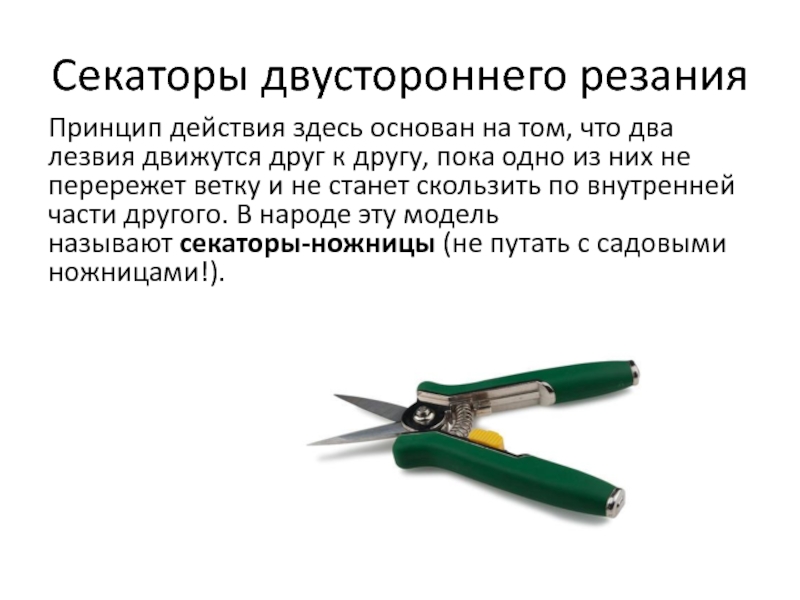 движутся друг к другу, пока одно из них не перережет ветку и не станет скользить по внутренней части другого. В народе эту модель называют секаторы-ножницы (не путать с садовыми ножницами!).