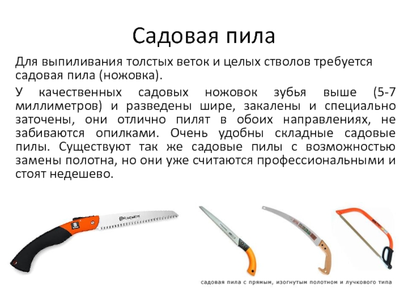 У качественных садовых ножовок зубья выше (5-7 миллиметров) и разведены шире, закалены и специально заточены, они отлично пилят в обоих направлениях, не забиваются опилками. Очень удобны складные садовые пилы. Существуют так же садовые пилы с возможностью замены полотна, но они уже считаются профессиональными и стоят недешево.