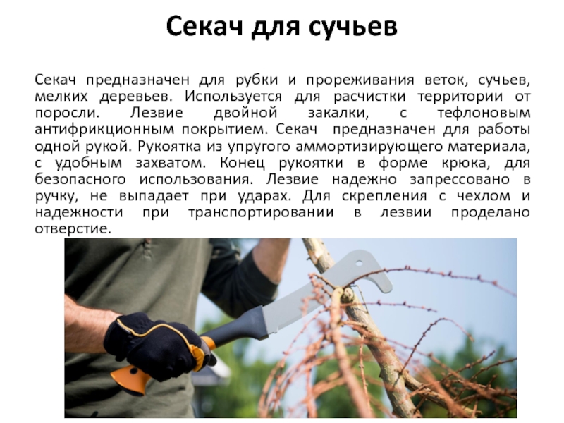 деревьев. Используется для расчистки территории от поросли. Лезвие двойной закалки, с тефлоновым антифрикционным покрытием. Секач предназначен для работы одной рукой. Рукоятка из упругого аммортизирующего материала, с удобным захватом. Конец рукоятки в форме крюка, для безопасного использования. Лезвие надежно запрессовано в ручку, не выпадает при ударах. Для скрепления с чехлом и надежности при транспортировании в лезвии проделано отверстие.