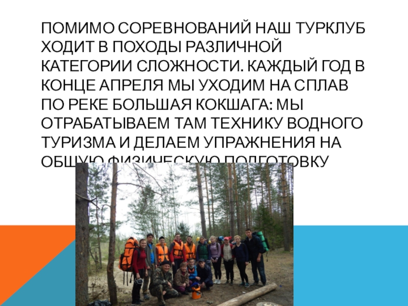 Слайд 3Помимо соревнований наш турклуб ходит в походы различной категории сложности. Каждый